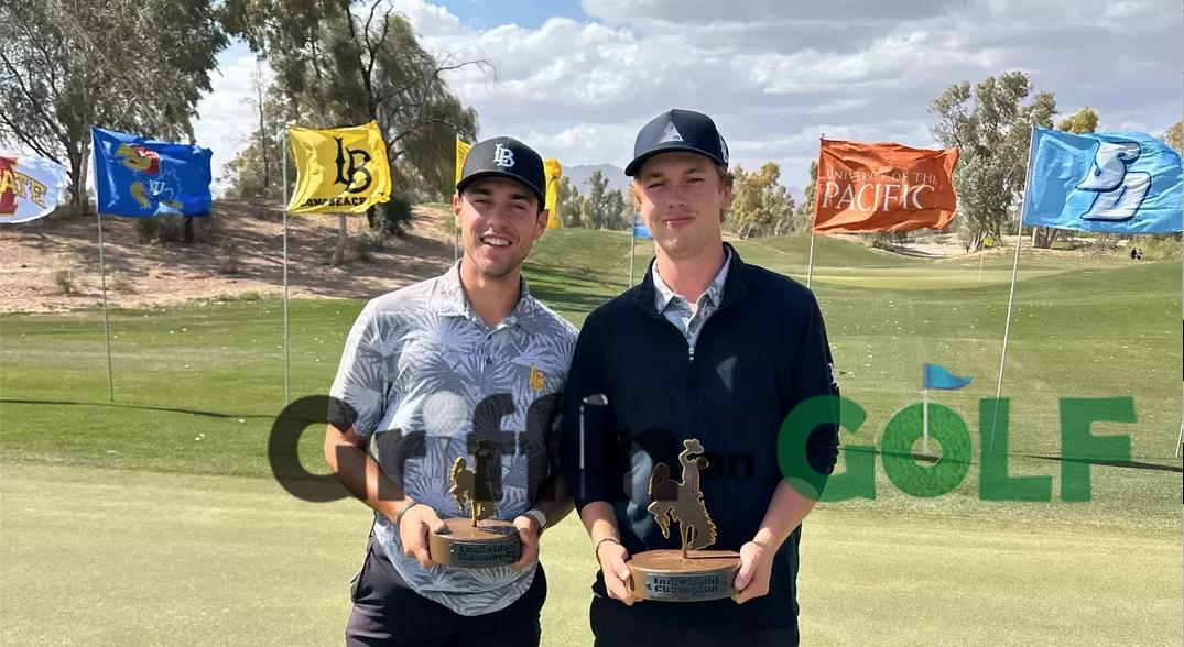 Charlie Forster (right) and Long Beach team-mate Alejandro de Castro Piera after their one-two victory in the Wyoming Cowboy Classic, in April. Picture LONG BEACH STATE ATHLETICS