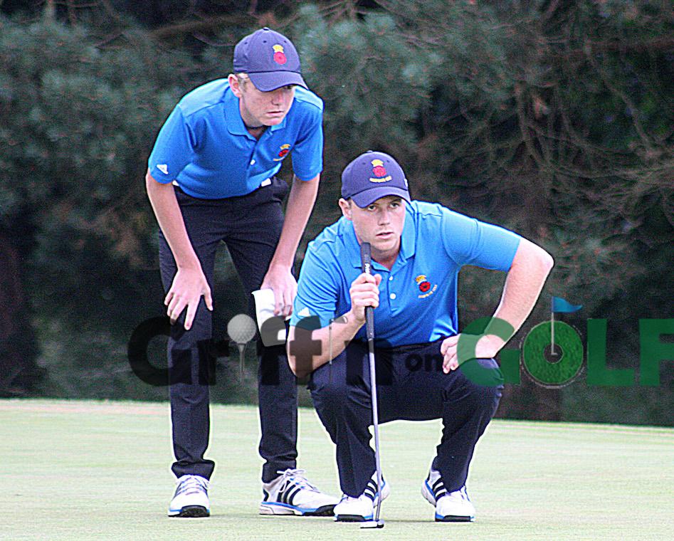 Harry Ellis lines up a putt on the 18th at Calcot Park during t0he 2016 South East Qualifier, watched by George Saunders Picture by ANDREW GRIFFIN / AMG PICTURES
