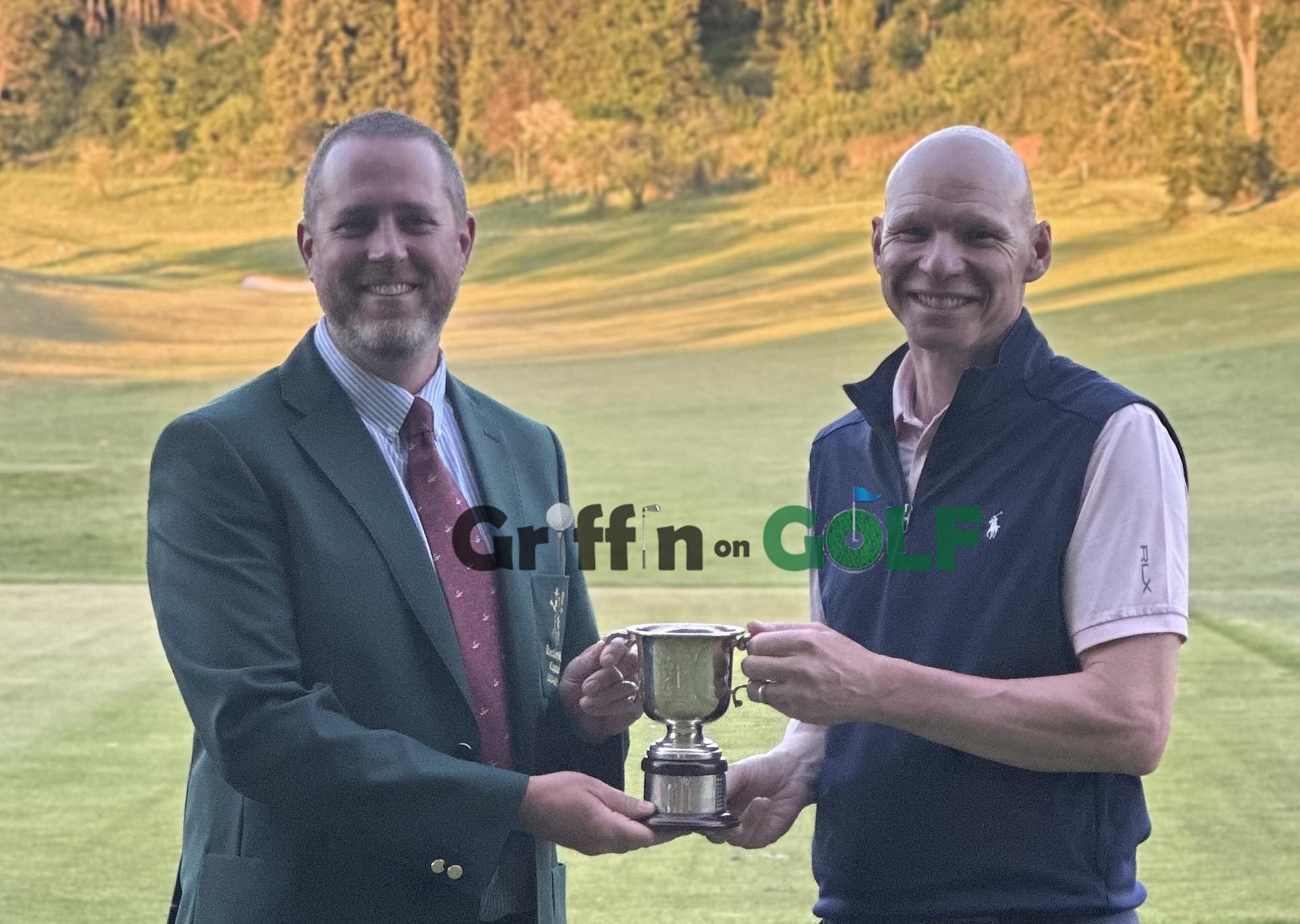 Sandford Springs’ James Knight (right) receives the Delhi Cup from Hockley GC captain Andy Dunne, after shooting two 67s to win the first Hampshire Order of Merit event of 2025. Picture HOCKLEY GOLF CLUB