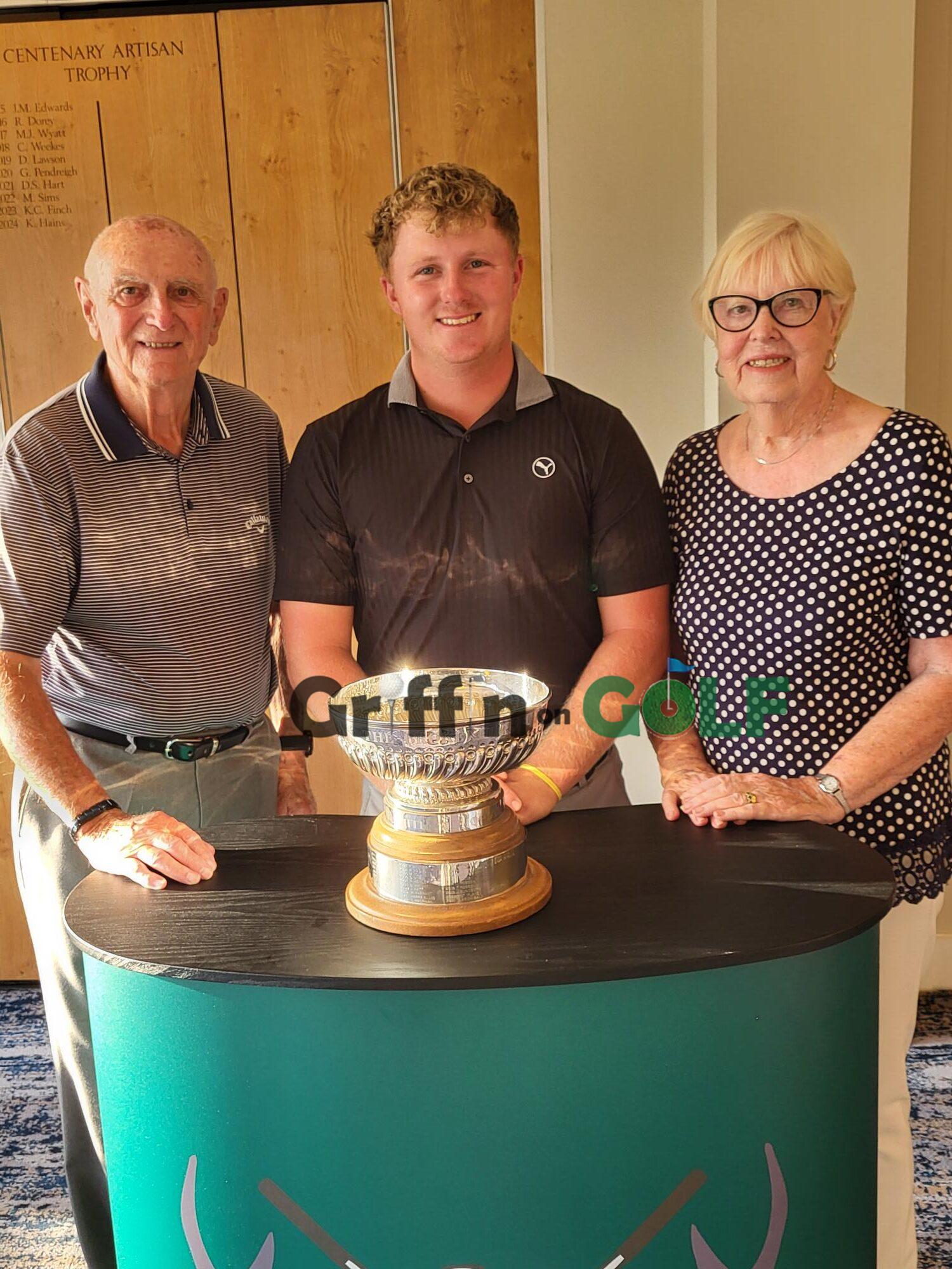Jamie Markwick (centre) with Mike Smith’s parents Trevor (left) and Gladwys who presented the winner with the trophy. Picture courtesy of BROKENHURST MANOR GOLF CLUB